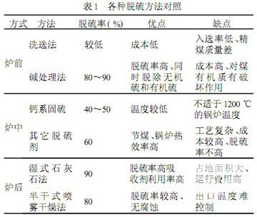 脫硫技術(shù)可分為爐前、爐中、爐后3種方式,各種脫硫方法對照見表1。
