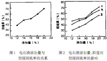 從圖1可知電石渣對型煤的固硫能力隨電石渣添加量的增加而提高。但注意必須控制電石渣的添加量不能過大,以免影響型煤的燃燒狀況和熱損失。圖2中 ,1、 2、 3 條曲線代表電石渣粒度越來越大。反映出電石渣的粒度對固硫效果有一定影響。電石渣粒度越小,固硫能力越強(qiáng)。所以增加電石渣的比表面積有利于提高固硫率。