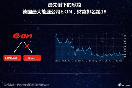 這些恐龍?jiān)趺礃恿耍吭诃h(huán)境已經(jīng)發(fā)生變化的德國(guó),他最大能源公司E.ON是最先倒下的恐龍。E.ON在2014年年底就宣稱碰到了前所未有的挑戰(zhàn),面對(duì)兩個(gè)能源世界,一個(gè)是傳統(tǒng)的能源世界;另外一個(gè)是嶄新的能源世界。在傳統(tǒng)的能源世界,他們非常沮喪,新投的幾億美元的天然氣電站,可能在一年時(shí)間也就只有十幾天可以帶負(fù)荷發(fā)電。在這么一個(gè)氣候已經(jīng)變化的環(huán)境中,市場(chǎng)機(jī)制已經(jīng)在篩選出一些物種。