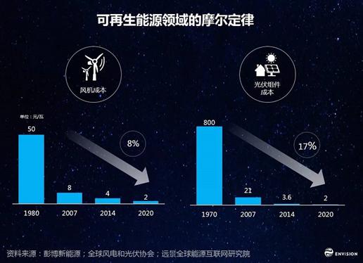 新能源行業(yè)也有指數(shù)性的變化,從1970年開(kāi)始,光伏以平均17%的速度在降本,風(fēng)電8%,如果再以這種趨勢(shì)往下走,也會(huì)接近指數(shù)式的穿透。當(dāng)風(fēng)電和太陽(yáng)能發(fā)電的成本都顯著的低于火電的時(shí)候,人們?cè)趺磿?huì)有動(dòng)力要來(lái)建設(shè)這么多燃煤電場(chǎng)和天然氣電站呢?為什么還要建設(shè)龐大的堅(jiān)強(qiáng)的電網(wǎng)呢?恰恰就是顛覆性的技術(shù)進(jìn)步導(dǎo)致了可再生能源成本優(yōu)勢(shì)凸顯。