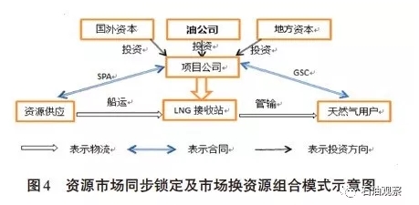 該模式下油公司作為L(zhǎng)NG供銷和流轉(zhuǎn)的中間環(huán)節(jié),作為中游基礎(chǔ)設(shè)施建設(shè)主要投資者,與其他資本聯(lián)合成立項(xiàng)目公司(如圖4所示)。項(xiàng)目公司作為主 體負(fù)責(zé)LNG接收站、管線建設(shè)和運(yùn)營(yíng),與上游資源供應(yīng)方簽訂“照付不議”的長(zhǎng)期液化天然氣供應(yīng)合同(SPA),同時(shí)與下游用戶(城市燃?xì)夤尽⑷細(xì)怆姀S及工業(yè)用戶)簽訂“照付不議”的長(zhǎng)期天然氣銷售 合同(GSC),即由項(xiàng)目公司在進(jìn)行接收站運(yùn)營(yíng)的同時(shí)實(shí)施LNG采購(gòu)和銷售。