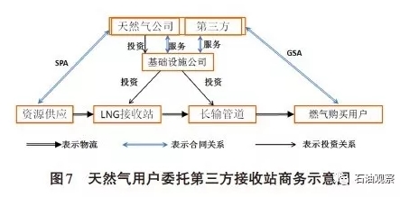 (2)第三方委托加工模式該模式類似歐洲天然氣改革后的進(jìn)口模式,也是在中國(guó)實(shí)施《油氣管網(wǎng)設(shè)施公平開放監(jiān)管辦法(試行)》框架下的商務(wù)模式,第三方以委托形式,委托 建設(shè)經(jīng)營(yíng)管理的LNG接收站、輸氣管線的基礎(chǔ)設(shè)施公司(如接收站項(xiàng)目公司)提供LNG接收、存儲(chǔ)、汽 化、管輸天然氣服務(wù)。同時(shí)直接與資源供應(yīng)商簽訂資源供應(yīng)合同(SPA),與燃?xì)赓?gòu)買用戶簽訂天然氣銷售協(xié)議(GSA),如圖7所示。