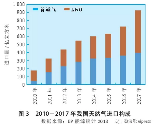 2017年我國LNG進口量驟增近1/2,達到526億立方米,比管道氣的394億立方米高出了33%(見圖3),LNG在保障我國能源供應中的作用日益凸顯。