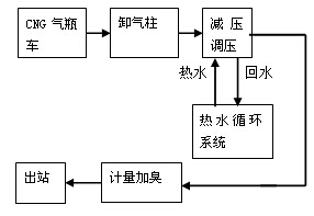 壓縮天然氣氣瓶車進入儲配站后,首先通過卸氣柱上的高壓軟管將CNG氣瓶車與卸氣柱連接,在減壓調壓裝置內天然氣經換熱器加熱,通過二級或三級調壓,然后經計量、加臭后進入市政中壓管網。熱水循環系統通常由熱水鍋爐、循環水泵、供水回水管路組成,功能是加熱天然氣,防止壓縮天然氣在減壓過程中溫度的急劇下降[2]。