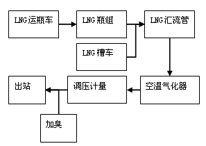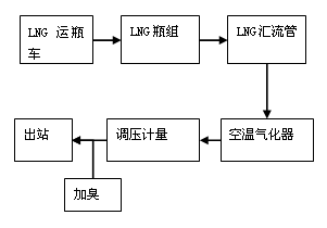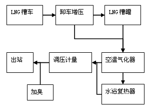 在站區內將LNG槽車與站內槽罐氣、液相管道相連,用卸車增壓器將槽車內壓力增高,然后利用槽車與儲罐間的壓差將LNG導入儲罐內。對外供氣時,儲罐內LNG出液進入到空溫式氣化器,在氣化器中液態天然氣氣化并加熱,轉化為氣態的天然氣,經過調壓、計量、加臭后進入站后燃氣主管網。