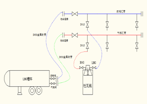 槽車、杜瓦瓶聯合供氣站是瓶組站技術和槽車直供技術的結合,LNG槽車氣、液相管與杜瓦瓶瓶組氣、液相管共同接在站內氣、液相匯流管上。工藝設計上,匯流管起點預留LNG槽車法蘭接口和切斷閥門,利用杜瓦瓶自增壓功能,將杜瓦瓶氣相與瓶組撬氣相匯流管連接,將LNG槽車氣相管與瓶組撬氣相匯流管連接。通過氣相匯流管,使得杜瓦瓶氣相與槽車氣相連通,在槽車罐內壓力較低時,可開啟杜瓦瓶自增壓閥對槽車的增壓。其工藝連接示意圖如下圖5。