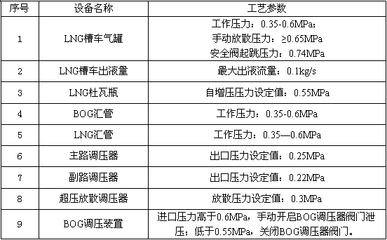 對于槽車、杜瓦瓶聯合運行方式,運行參數的設定非常重要。根據LNG工藝設備參數和實際運行經驗,一個設計流量為500m3/h的氣化站,運行參數可按照下表1設定。
