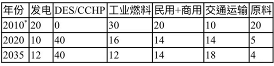 3、用于冶金、建材、煉油等高溫加熱,難以采用CCHP的工業(yè)燃料2020年需700億m3/a;2035年1000億m3/a。民用和商用氣分別為600億m3/a和900億m3/a.。考慮高耗能工業(yè)發(fā)展減速、DES/CCHP加速等因素2020--2035年的增幅減小。
