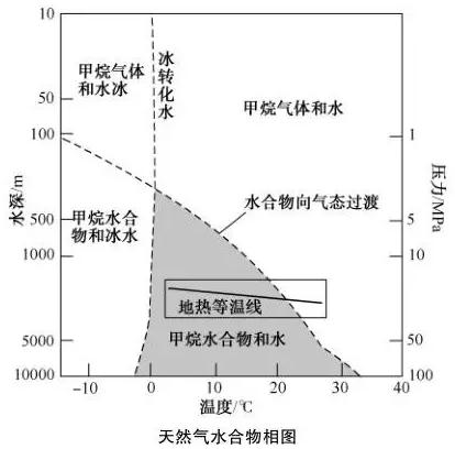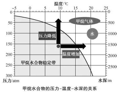 全球99%的可燃冰存在于海底的可燃冰穩定帶之中。“天然氣水合物相圖”表示了可燃冰生成的水深-溫度-壓力的關系。溫度越低,水越深,水壓力越大,可燃冰越利于生成。