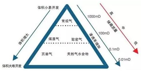 天然氣儲層級別越低,就意味著滲透率降低,開采程度越困難。這種低滲透氣藏的滲透率按照:致密氣→煤層氣→頁巖氣→天然氣水合物的順序遞降;其儲量卻按此順序增加,它們都比高滲透的常規天然氣藏豐富得多。而可燃冰廣泛分布在海底,雖然開采難度遠比前三者難,但儲量極為豐富。