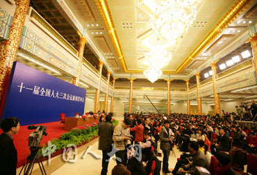 十一屆全國人大三次會議于3月4日11時在人民大會堂三樓金色大廳舉行新聞發布會,由大會發言人李肇星就會...