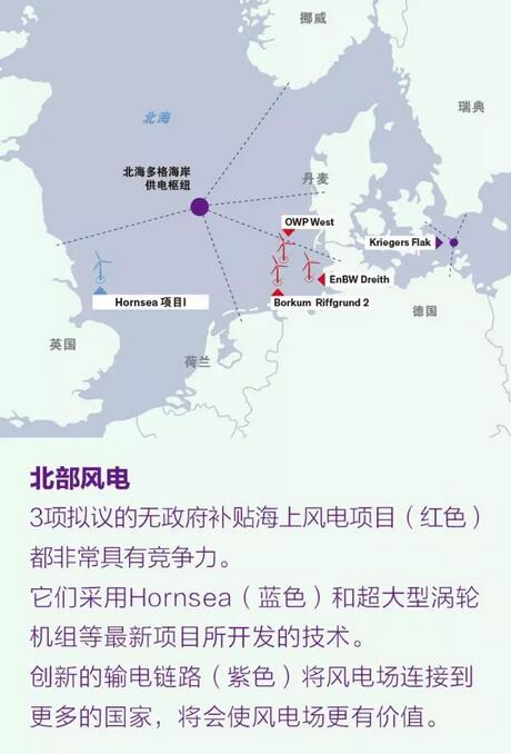 近期投標的近岸項目同時與陸上風電和太陽能發電展開了成本競爭。丹麥和荷蘭的幾個項目承諾海上風電成本將會低于75歐元/兆瓦時。今年4月,哥本哈根的Dong Energy公司和德國巴登符騰堡州能源設備公司投標了無補貼的德國風電項目。Dong公司的監管事務高級主管烏爾里克•斯特里德比克(Ulrik Stridbaek)估計,其項目的發電成本為62歐元/兆瓦時。