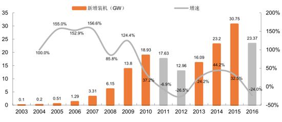 2016 年,國內新增風電裝機 23.37GW,同比大幅下滑 24%。一方面,搶裝過后,需求有所透支;另一方面,國內棄風率維持高位,政府出臺更嚴格的管控措施應對棄風問題。