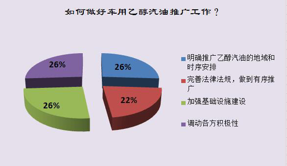 大部分受訪者認(rèn)為,明確推廣乙醇汽油的地域和時(shí)序安排;完善法律法規(guī),做到有序推廣;加強(qiáng)基礎(chǔ)設(shè)施建設(shè);調(diào)動(dòng)各方積極性,這四個(gè)選項(xiàng)都對(duì)車用乙醇汽油的推廣工作起到關(guān)鍵作用。