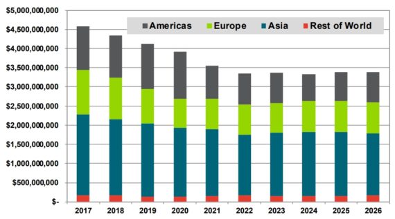 2017年,風(fēng)機材料市場的估計值為45.7億美元。其中,亞洲市場代表著風(fēng)機葉片材料的最大區(qū)域需求,預(yù)計2017年的市場規(guī)模為21.2億美元,其次是歐洲11.6億美元,緊隨其后的是美洲11.3億美元。考慮到全球風(fēng)能市場的規(guī)模大且日趨成熟的性質(zhì),在未來十年風(fēng)機葉片材料的增長率并不是太大,在大多數(shù)市場上已經(jīng)達到頂峰并趨于平穩(wěn)。