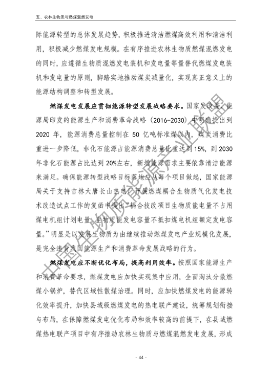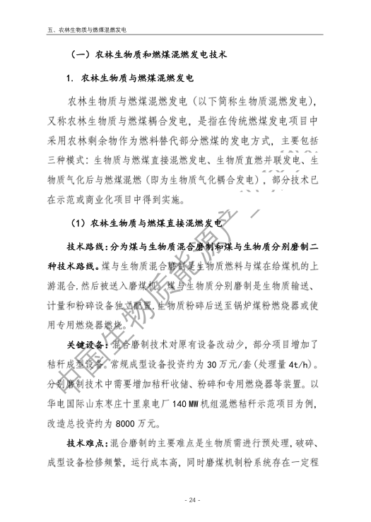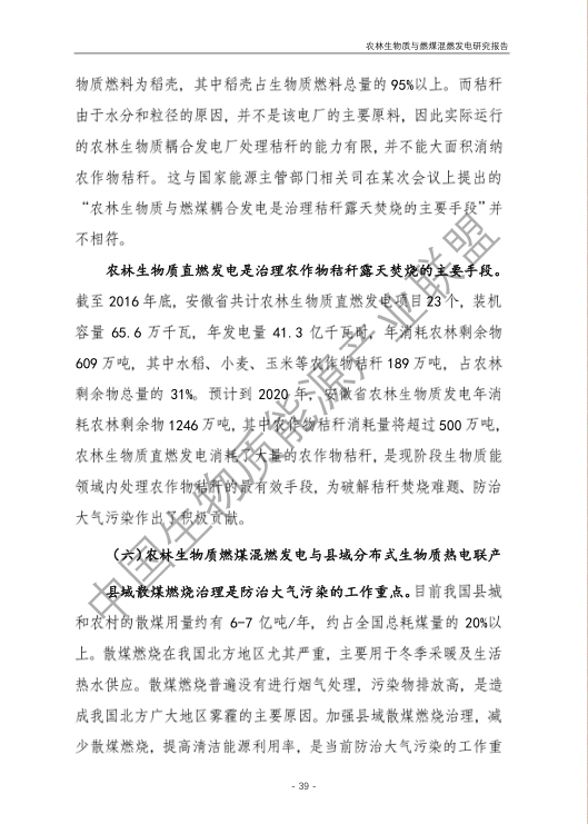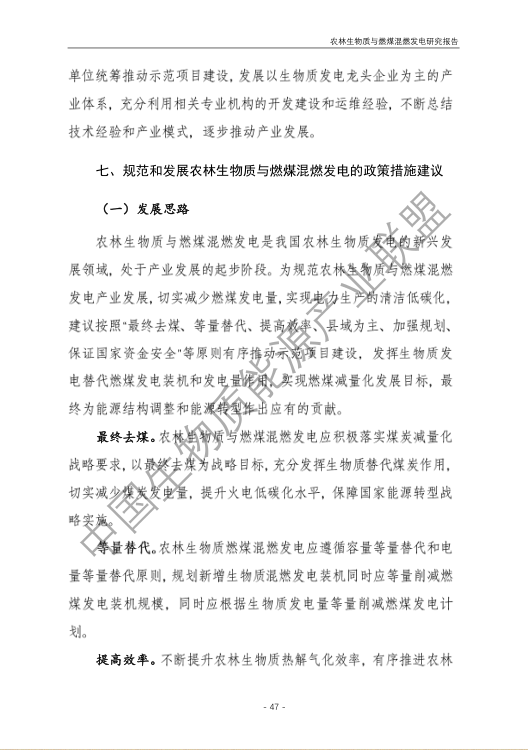 6.農林生物質與燃煤混燃發電應以最終去煤為目的,發揮等量替代作用,實現縣城熱電聯產發展,加強規劃布局和監督管理。報告提出農林生物質與燃煤混燃發電發展思路與實施路徑。一是糾正生物質發電量不占用煤電機組計劃電量、生物質發電容量不抵扣煤電機組額定發電容量”的發展原則,以替代煤炭為主要方向,實現混燃發電最終去煤化發展,規劃布局生物質混燃發電裝機應同等減少煤電裝機,并根據生物質發電量等量削減燃煤發電計劃。二是堅持以縣域分布式熱電聯產發展的根本定位,明確以符合生物質能產業統一規劃管理為前提,統籌規劃布局生物質發電項目和混燃發電示范項目,實現熱電聯產技術示范和應用。三是推動產業技術標準和監管體系建設,加強監督管理,防止以生物質混燃發電名義變相增加煤電機組利用小時數和燃煤發電量指標,切實落實烯煤發電量削減計劃。