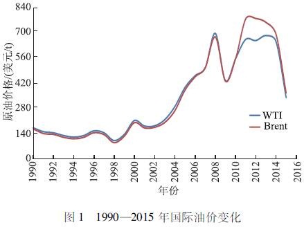 從近年來油價的變化(圖1)來看,1990—2004年國際油價都低于280美元/t,而且這期間有一半以上的時間國際油價徘徊在84~210美元/t。2004—2014年,國際油價開始進入新階段,價格踏上280~1050美元/t的臺階;2014—2015年國際油價從770美元/t一路狂跌到259美元/t。這期間國際油價有9次大的變動,分析動蕩的原因,特別是低油價形成的影響因素,對認識目前低油價的形成背景、確定海外勘探發展方向具有重要意義。
