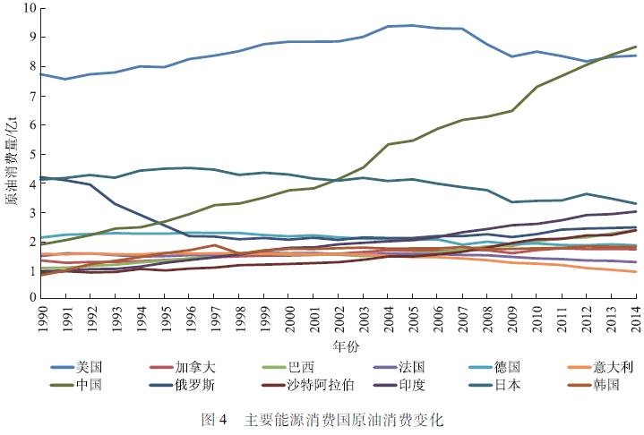 從需求上看,傳統消費大國美國、日本、德國、法國、意大利和俄羅斯原油消費持續下降(圖4),而中國、巴西、韓國、加拿大、沙特阿拉伯和印度等國家的原油消費量不斷增長。