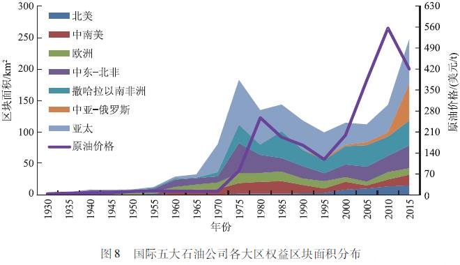 低油價時期單純的上游勘探開發公司相對一體化公司容易出現現金流不足而面臨經營困境的狀況。而油價跌入谷底時,是現金流相對充裕的公司抄底并購、優化公司資產結構的最佳時機,這時候大部分公司資產收購和剝離頻繁,更偏向于投資風險小的陸上區塊(圖5)。一體化的石油巨頭之間也可能通過兼并、重組大幅度降低成本,顯著提高經濟效率,擴大規模,提高競爭力。