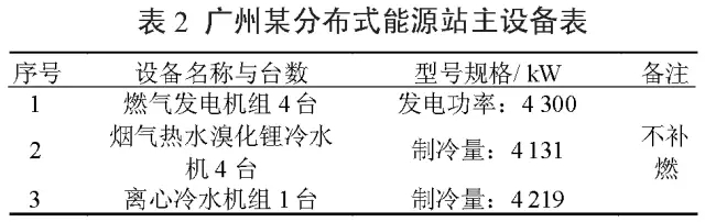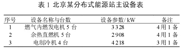 該數據中心項目包含綜合辦公區和數據中心區兩個區域,數據中心分布式能源站(見表1)為數據中心供電、項目全年供冷和冬季供熱等能源服務。項目電負荷為14323kW,冷負荷為10100kW,全年用電量為10014.65×104kW˙h,全年制冷量為31.43×104GJ。