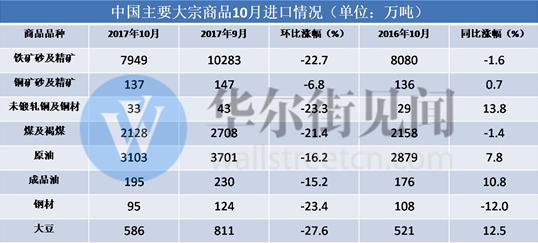 受限產(chǎn)和國慶長假等因素的共同影響,10月,鐵礦石、煤炭等大宗商品進(jìn)口量環(huán)比大跌。