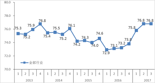 調查顯示,2017年三季度全國工業產能利用率為76.8%,與二季度持平,與去年同期相比提高3.6個百分點。前三季度累計,工業產能利用率為76.6%,同比提高3.5個百分點,為近五年來最高水平。