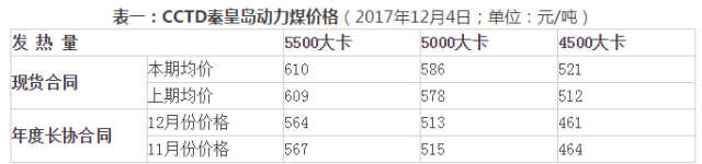本報告期(11月25日至12月1日,見表一),“CCTD秦皇島動力煤價格”所采集的環渤海地區各種現貨動力煤價格整體上呈現止跌跡象,低熱值現貨動力煤價格則略有回升。其中,CCTD5500報收于610元/噸,比11月27發布的價格上漲了1元/噸;CCTD5000報收于586元/噸,比11月27發布的價格上漲了8元/噸。