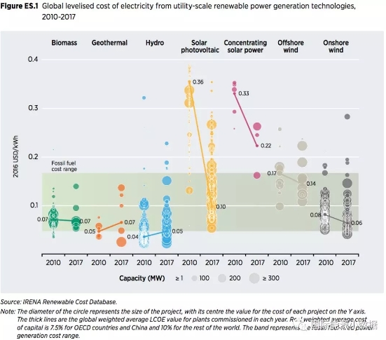 可再生能源署(IRENA)發(fā)布《可再生能源發(fā)電成本報告》,披露全球范圍內(nèi)2017年投運的生物質(zhì)發(fā)電、地熱發(fā)電、水電、陸上風電、海上風電、光熱發(fā)電、大型地面光伏的加權(quán)平準發(fā)電成本(levelised cost of electricity,簡稱LCOE,以2016年美元不變價格計算)。針對每一種技術(shù),LCOE的計算考慮全生命周期內(nèi)的投資、運營成本和收益,包括資本成本(中國和經(jīng)合組織國家為7.5%,其他國家10%)。