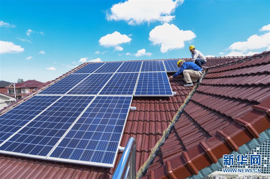 8月29日,在浙江省慈溪市周巷鎮小安村,工作人員在對用戶新裝的居民屋頂光伏設備進行檢查。   新華社記者 徐昱 攝
