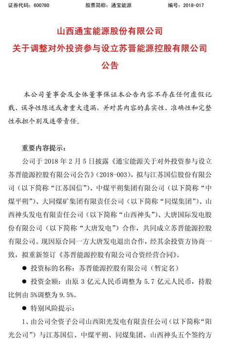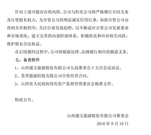 山西通寶能源股份有限公司日前發(fā)布公告:因原合同一方大唐發(fā)電退出合作,經(jīng)其余投資方協(xié)商一致,擬重新簽訂《蘇晉能源控股有限公司合資經(jīng)營合同》。