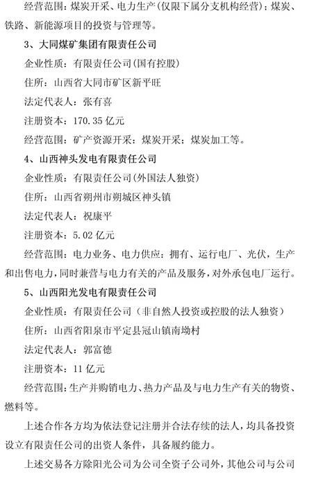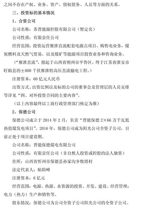 由陽光公司以現(xiàn)金和其全資子公司晉能保德煤電有限公司(以下簡稱“保德公司”)全部股權(quán)按市場評估價值作價出資,與江蘇國信、中煤平朔、同煤集團、山西神頭合作,擬重新簽訂《蘇晉能源控股有限公司合資經(jīng)營合同》,共同成立蘇晉能源控股有限公司。