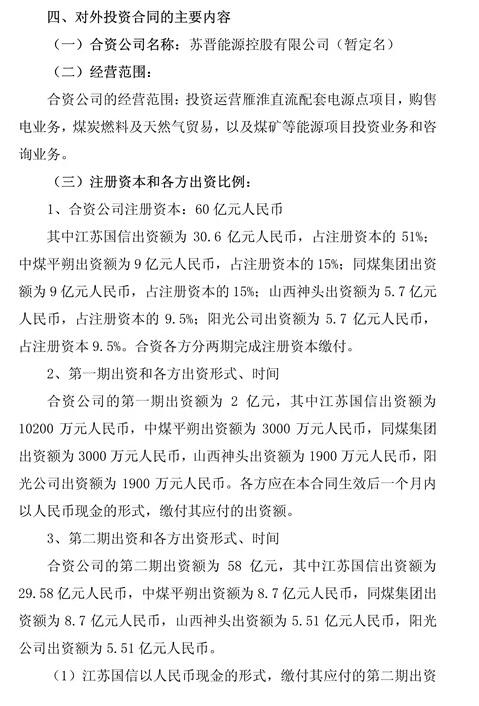 合資公司注冊資本仍為60億元人民幣,其中江蘇國信全部以現(xiàn)3金出資30.6億元人民幣,占注冊資本51%;中煤平朔出資額為9億元人民幣,占注冊資本的15%;同煤集團出資額為9億元人民幣,占注冊資本的15%;山西神頭出資額為5.7億元人民幣,占注冊資本的9.5%;陽光公司出資額為5.7億元人民幣,占注冊資本9.5%。