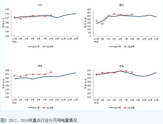 1-8月份,化學原料制品、非金屬礦物制品、黑色金屬冶煉和有色金屬冶煉四大高載能行業用電量合計12483億千瓦時,同比增長5.2%;合計用電量占全社會用電量的比重為27.6%,對全社會用電量增長的貢獻率為16.6%。其中,化工行業用電量2938億千瓦時,同比增長2.2%;建材行業用電量2236億千瓦時,同比增長5.6%;黑色金屬冶煉行業用電量3536億千瓦時,同比增長11.2%;有色金屬冶煉行業3773億千瓦時,同比增長2.2%。