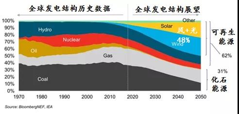2019年7月,彭博新能源財經(jīng)發(fā)布了2019-2050年全球新能源市場展望,預(yù)計到2050年,風(fēng)電和光伏將占全球電力系統(tǒng)近一半的裝機量,并在2030年前幫助電力行業(yè)保持在控制溫升2度以內(nèi)的軌道上。