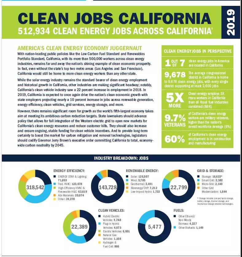 ——在全州范圍內,2018年清潔能源行業共有512,934個就業崗位。其中包括可再生能源就業,如安裝太陽能和風能;建設電動和混合動力汽車;在建筑物中進行能源效率工作;制造清潔燃料和建設電池存儲項目。