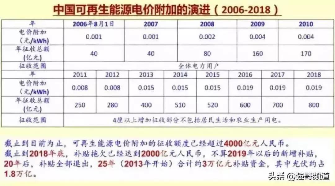 國家發(fā)改委能源研究所研究員王斯成測(cè)算,目前我國可再生能源電價(jià)附加的征收額度已超過4000億元人民幣。截至2018年底,補(bǔ)貼拖欠已達(dá)到2000億元人民幣,不包括2019年以后的新增補(bǔ)貼。20年后,補(bǔ)貼全部退出,從2013年算起25年合計(jì)約3萬億元補(bǔ)貼資金,其中光伏約占1.8萬億元。