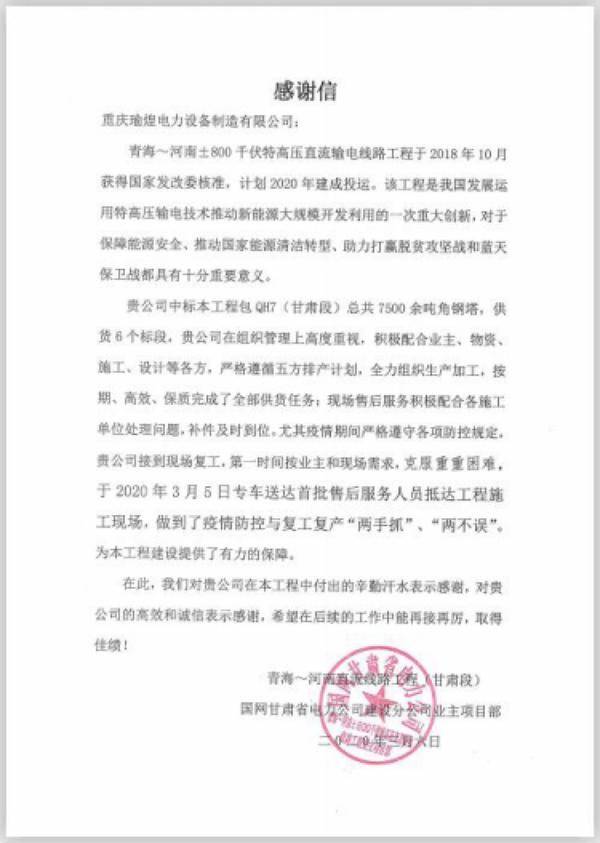 據(jù)悉,重慶順泰鐵塔制造有限公司瑜煌廠區(qū)近期收到國網(wǎng)甘肅省電力建設(shè)分公司業(yè)主項(xiàng)目部的感謝信,對重慶順泰按期、高效、保質(zhì)完成青海~河南±800千伏特高壓直流輸電線路工程(甘肅段)供貨任務(wù),并在新冠肺炎疫情期間落實(shí)疫情防控與復(fù)工復(fù)產(chǎn)“兩手抓”、“兩不誤”,第一時(shí)間按照業(yè)主和現(xiàn)場需求,克服重重困難,派專車將首批售后服務(wù)人員送往施工現(xiàn)場,為該工程建設(shè)提供有力保障表示感謝。