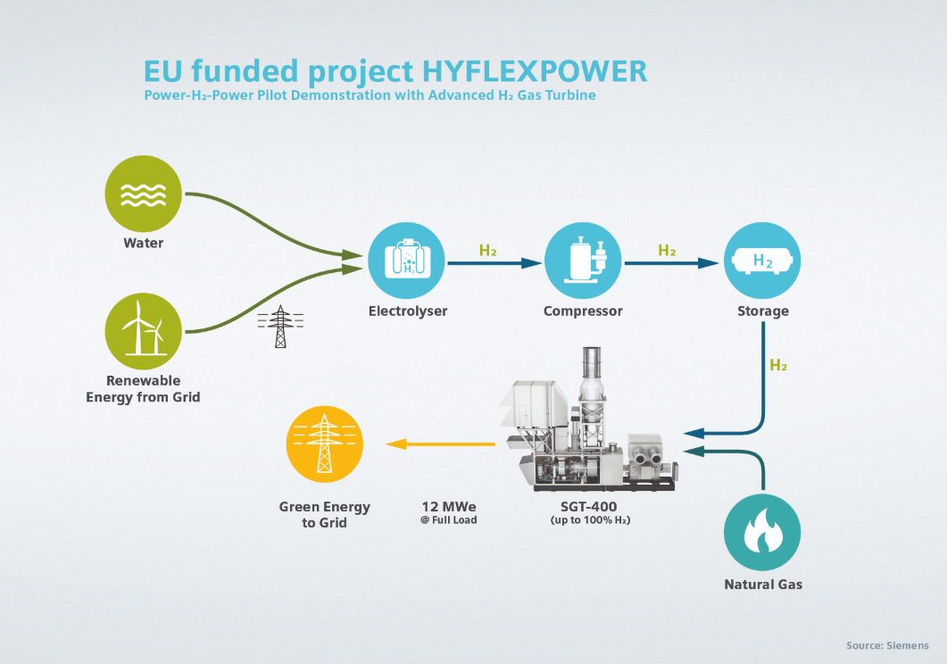 Engie Solutions、西門子油氣與電力公司、Centrax有限公司、Arttic公司、德國航空航天中心(DLR)以及四所歐洲大學組成聯合項目團隊啟動實施HYFLEXPOWER項目。這一項目由歐盟委員會根據“地平線2020研究和創新框架計劃”(授予協議884229)進行資助,是全球第一個裝備了先進氫氣燃氣輪機的工業級規模Power-to-X-to-Power的示范項目。項目將落地Smurfit Kappa PRF——一家專門生產環保再生紙的公司,位于法國維埃納河畔賽拉的工廠。該項目旨在驗證從可再生能源電力中制氫和儲存氫,并添加到目前熱電聯產電廠使用的天然氣中,最高可實現100%燃料用氫。為實現這一目標,將對一臺現有的西門子SGT-400工業燃氣輪機將進行升級,以便實現將儲存的氫氣轉化為電能和熱能。