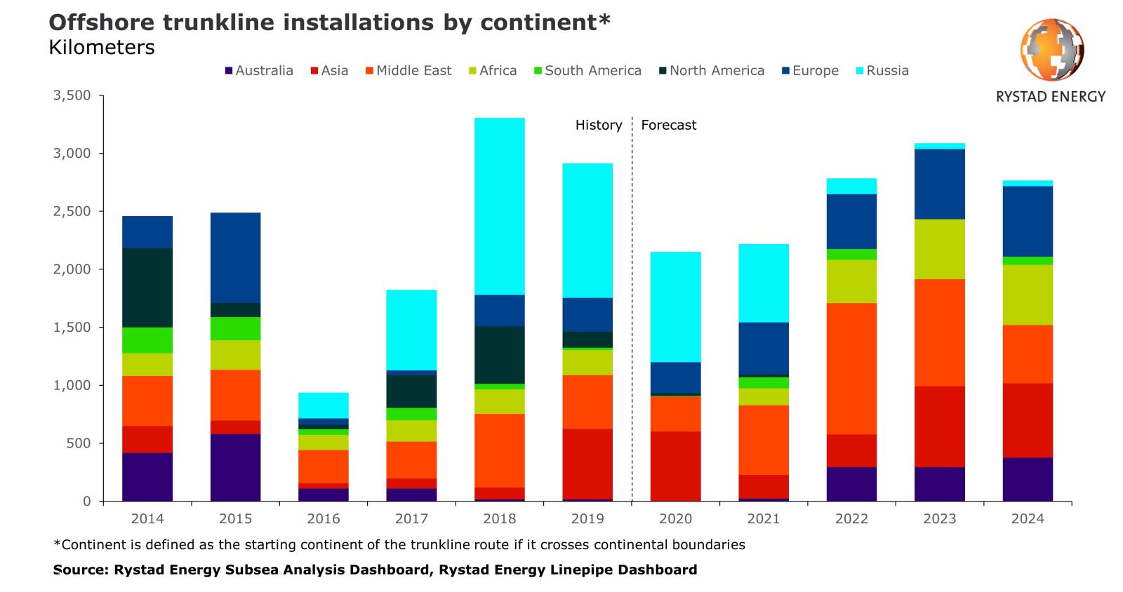 Rystad Energy估計,這次市場的復蘇將很快,因為中東項目很可能會將需求在2022年推升至Covid-19之前的水平,并從2023年進一步推高,屆時海上干線的安裝量預計將超過3,000 km。