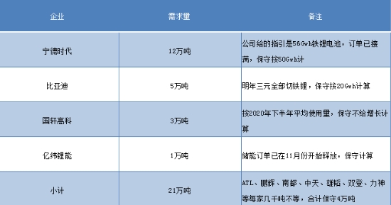 首先從產量方面來看,12月份數據雖然還未出爐,但主流企業繼續保持滿產,德方和裕能的新產能投放出一部分,預計當月產量在1.9萬噸左右,全年產量可以達到14萬噸,同比增長40%以上。如果明年整體維持今年四季度這種勢頭,月均產量超過2萬噸基本上是板上釘釘的事情,年產量25萬噸相當保守。從電池廠的生產安排來看,目前相對明確的幾家電池廠的需求量如下: