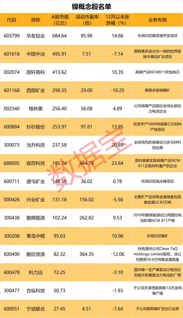 根據證券時報.數據寶梳理,A股中涉及鎳的上市公司有16家,多家上市公司均在印尼鎳礦有業務布局。