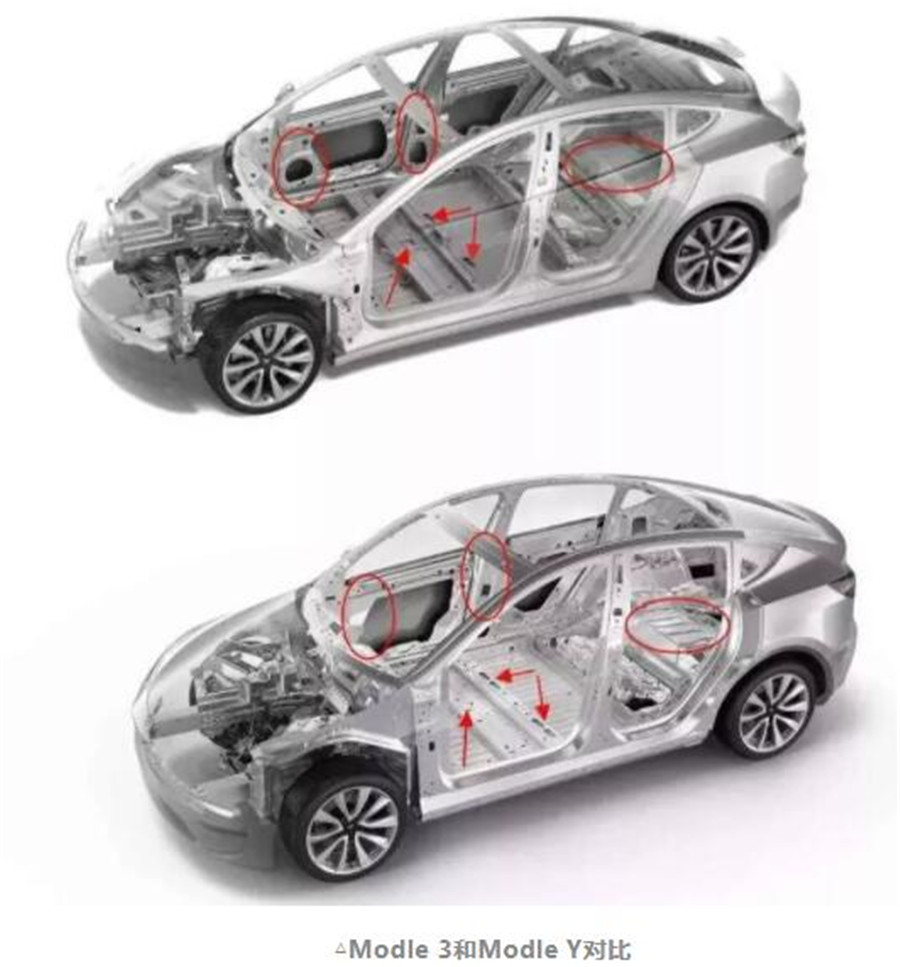 而且Model Y的零件不但可以享受規模效應,還將能用上大批新的降成本技術。舉個例子,Model Y有一項新專利是關于一體沖壓成型車身的工藝,將過去單個零部件沖壓再拼裝的過程一步到位,這會顯著的降低生產成本。