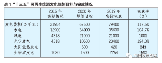 截至2019年,我國可再生能源發電裝機達到79400萬千瓦,實際完成率117.6%;其中水電裝機完成率104.7%、風電裝機完成率100%、光伏發電裝機完成率194%、生物質發電裝機完成率150%、太陽能熱發電完成率84%。除了太陽能熱發電沒有完成規劃目標、風電剛好完成目標外,其余可再生能源發電裝機都超額完成了規劃任務。