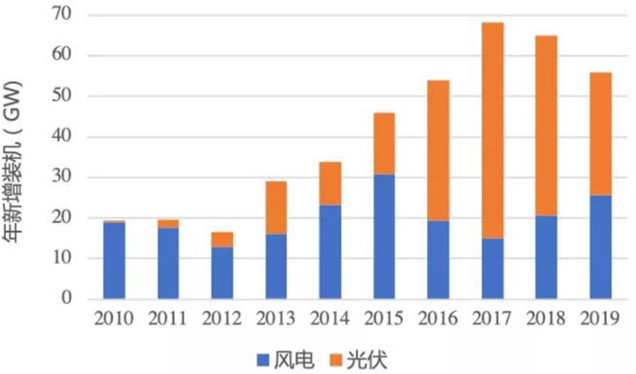 圖:最近十年風(fēng)電、光伏的年新增裝機情況