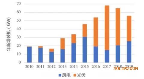 先從數據的層面看,數據顯示,近年來我國風電、太陽能發電裝機始終保持迅猛增長態勢。2014—2019年,全國風電和太陽能發電合計新增規模分別為33GW、48GW、54GW、68GW、65GW、56GW,2020年1—10月新增約46GW。