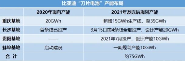 綜合以上四個生產基地規劃年產能,刀片電池的年產能有望達到75GWh。