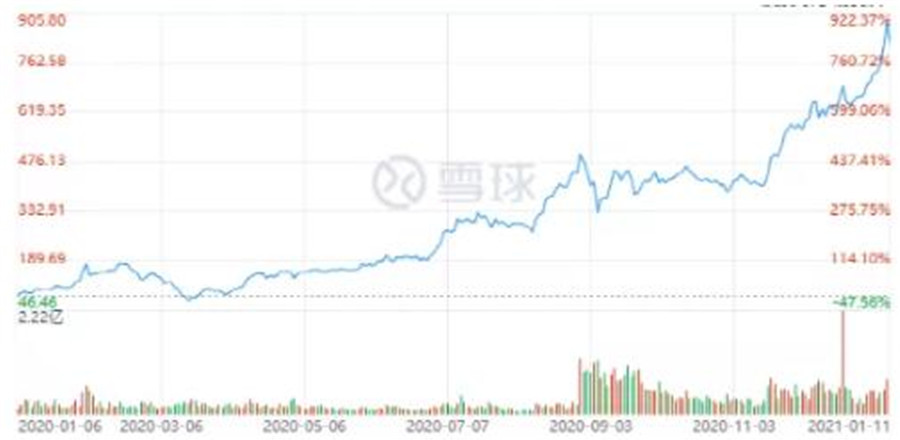 特斯拉股價也在2020年4月開始,開始了股價的急速拉升,在過去一年的統計區間內,特斯拉區間漲幅達到了815.58%。