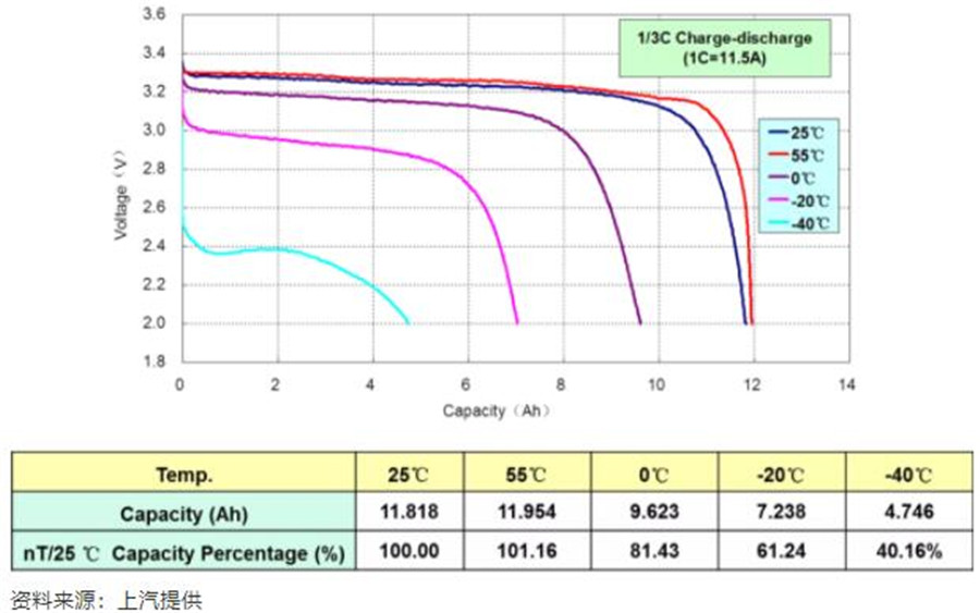 原理上看,低溫使鋰離子電池活性降低。電池在低溫條件下導(dǎo)電率降低,內(nèi)阻變大,最終導(dǎo)致可用容量降低。有的鋰電池在25℃時(shí)可用容量是100%,在-20℃時(shí),可用容量只有61.24%,如果在-40℃,只有40.16%(下圖)。