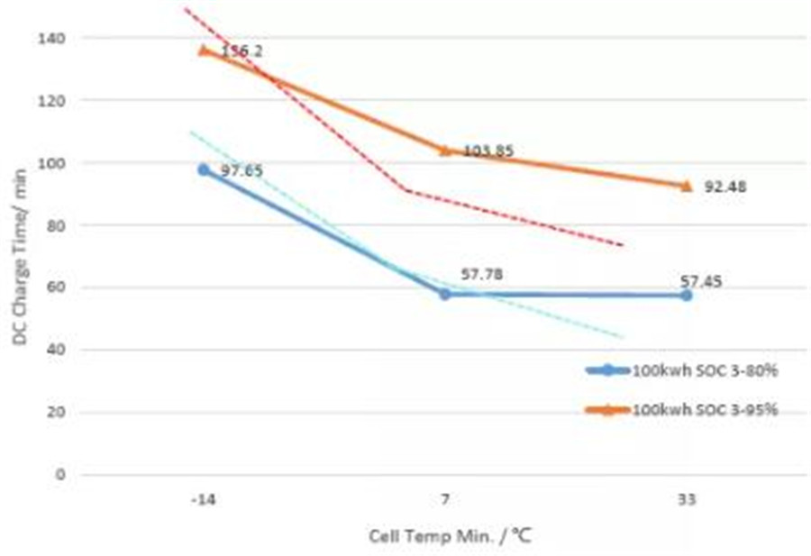 如下圖所示為某款電池在不同溫度下直流快充的時(shí)間變化。在-14℃與7℃比充電時(shí)間延長(zhǎng)超過(guò)70%(3%-80%SOC)。