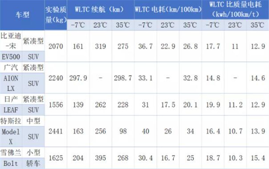 可以看到,在23℃時(shí),所有車輛續(xù)航最長(zhǎng),耗電最低。高溫、低溫都會(huì)對(duì)上述數(shù)據(jù)產(chǎn)生較大影響。